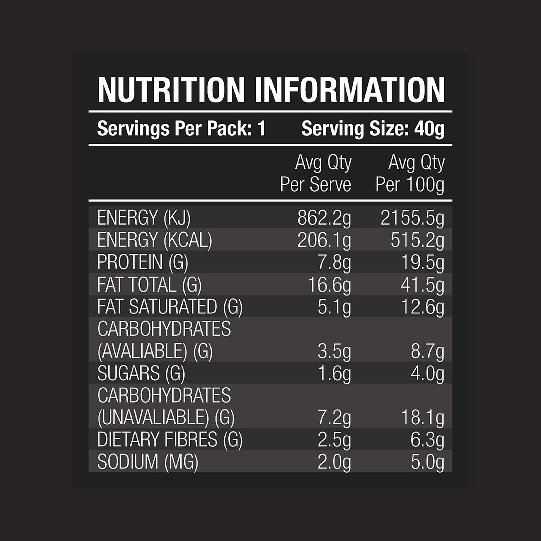 Hazelnuts (45%), Soluble Fibre from Tapioca Starch (IMO), Desiccated Coconut, Pea Protein, Cocoa Powder, Cocoa Butter, Natural Flavour, Almond, Cashew, Peanut, Soy Lecithin, Vitamin C (E300), Citric Acid, Monk Fruit, Mixed Tocopherols (Vitamin E)